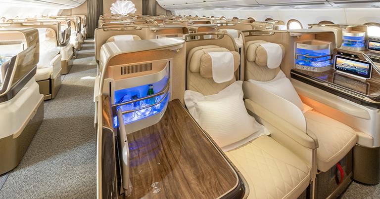 Business Class on both the A380 and Boeing 777 will receive a sophisticated upgrade with Emirates’ latest generation seating, inspired by the luxurious leather S Lounge seats by Safran, already featured on the airline’s A350 fleet. Each seat creates a more private space where thoughtful details elevate the journey, from wireless charging integrated into the side cocktail table to customisable in-seat lighting.